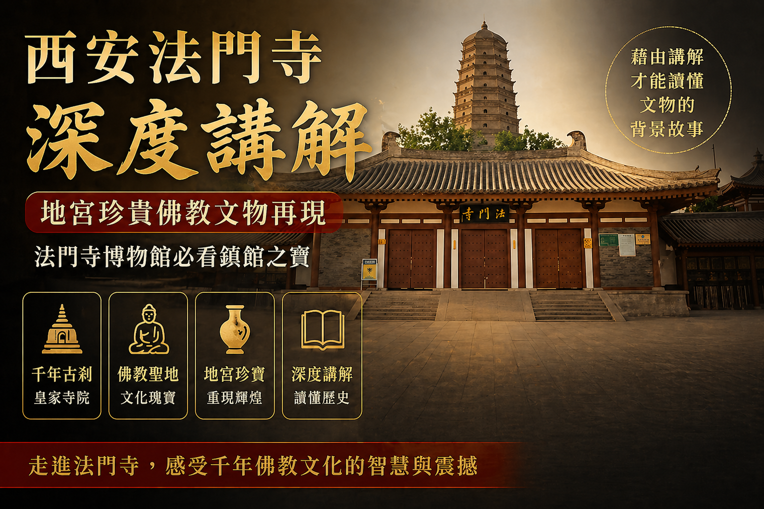 這次的深度講解課程,特別邀請當地帶團經驗資深豐富的黃老師,帶你真正看懂法門寺的前世今生,從歷史起源、皇家供奉,到震驚世界的地宮發現,一步一步走進這座千年佛教聖地的核心。